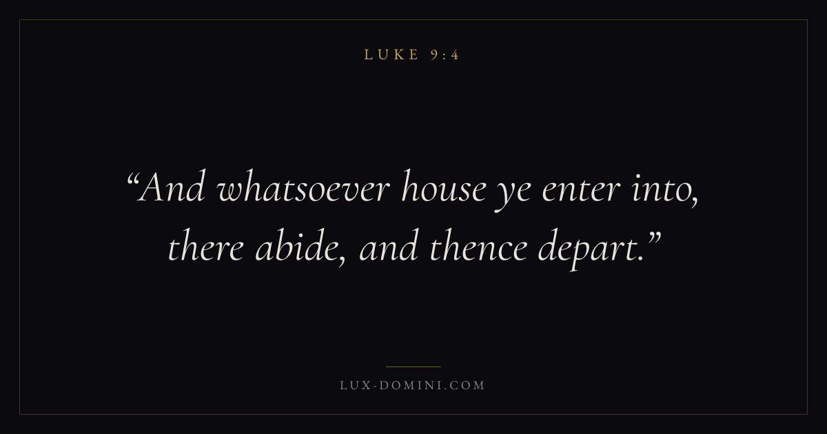 Books / Luke / Chapter 9 / Verse 4 ← Luke 9:3 Luke 9:4 Luke 9:5 → And whatsoever house ye enter into, there abide, and thence depart. Download verse card Share on Twitter Share on Facebook Pin it ✦ Key themes Anxiety and fearPrayerJustice and mercySalvationSpirit Read with Luke 9:1Luke 9:2Philippians 4:6Isaiah 41:10 Related topics Bible verses about anxiety and fearBible verses about prayerBible verses about justice and mercyBible verses about salvation ✦ Luke Chapter 9 verses V. 1 V. 2 V. 3 V. 4 V. 5 V. 6 V. 7 V. 8 V. 9 V. 10 V. 11 V. 12 V. 13 V. 14 V. 15 V. 16 V. 17 V. 18 V. 19 V. 20 V. 21 V. 22 V. 23 V. 24 V. 25 V. 26 V. 27 V. 28 V. 29 V. 30 V. 31 V. 32 V. 33 V. 34 V. 35 V. 36 V. 37 V. 38 V. 39 V. 40 V. 41 V. 42 V. 43 V. 44 V. 45 V. 46 V. 47 V. 48 V. 49 V. 50 V. 51 V. 52 V. 53 V. 54 V. 55 V. 56 V. 57 V. 58 V. 59 V. 60 V. 61 V. 62