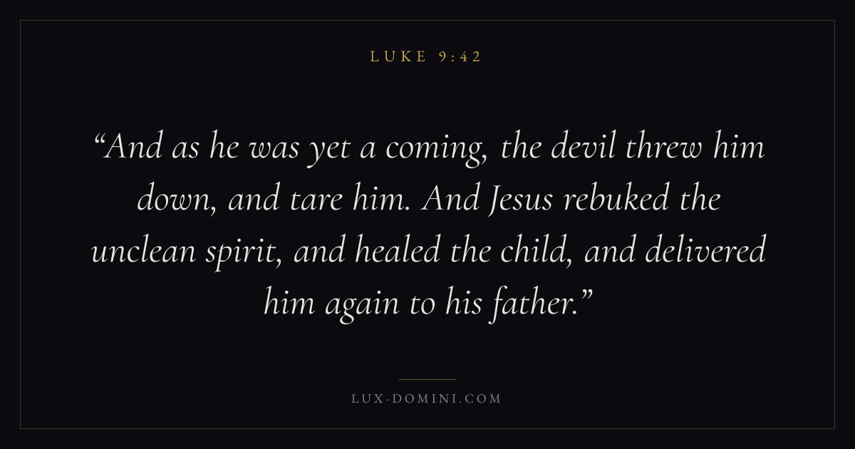 And as he was yet a coming, the devil threw him down, and tare him. And Jesus rebuked the unclean spirit, and healed the child, and delivered him again to his father.