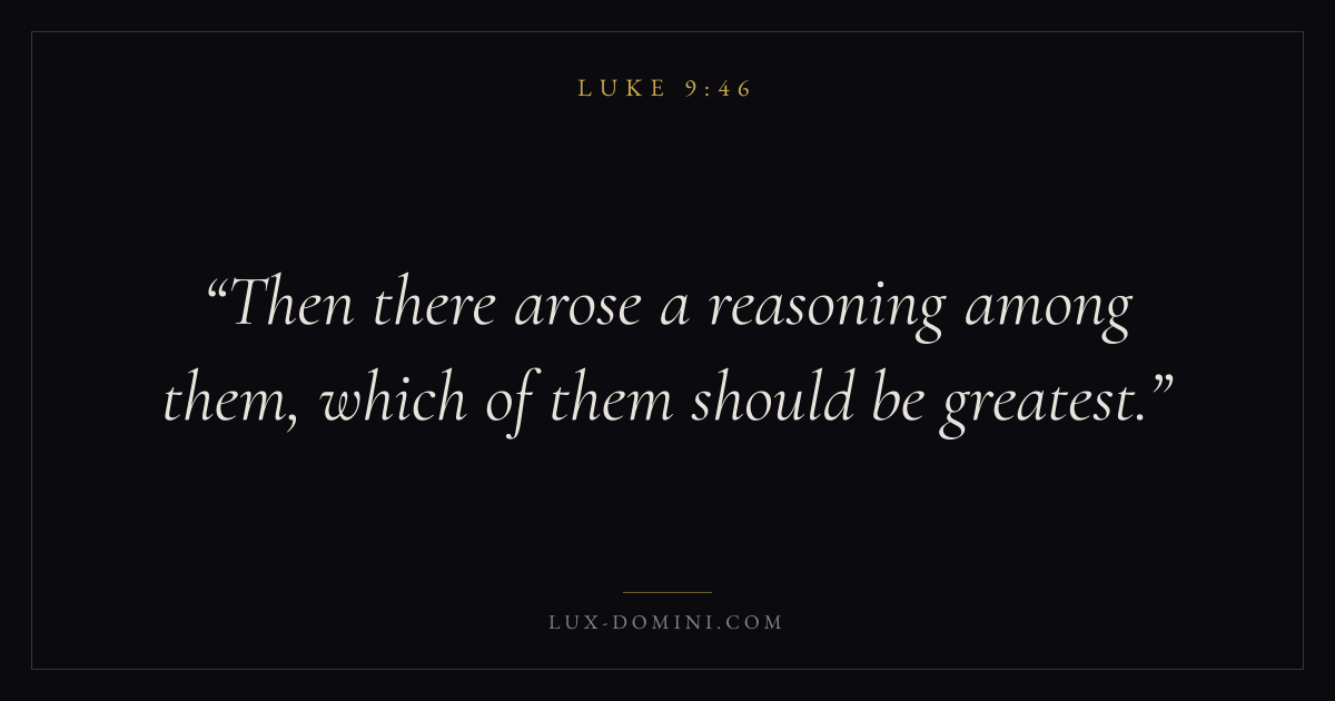 Books / Luke / Chapter 9 / Verse 46 ← Luke 9:45 Luke 9:46 Luke 9:47 → Then there arose a reasoning among them, which of them should be greatest. Download verse card Share on Twitter Share on Facebook Pin it ✦ Key themes PrayerJustice and mercySalvationHumilitySpirit Read with Luke 9:47Luke 9:48Matthew 6:9Luke 18:1 Related topics Bible verses about prayerBible verses about justice and mercyBible verses about salvationBible verses about humility ✦ Luke Chapter 9 verses V. 1 V. 2 V. 3 V. 4 V. 5 V. 6 V. 7 V. 8 V. 9 V. 10 V. 11 V. 12 V. 13 V. 14 V. 15 V. 16 V. 17 V. 18 V. 19 V. 20 V. 21 V. 22 V. 23 V. 24 V. 25 V. 26 V. 27 V. 28 V. 29 V. 30 V. 31 V. 32 V. 33 V. 34 V. 35 V. 36 V. 37 V. 38 V. 39 V. 40 V. 41 V. 42 V. 43 V. 44 V. 45 V. 46 V. 47 V. 48 V. 49 V. 50 V. 51 V. 52 V. 53 V. 54 V. 55 V. 56 V. 57 V. 58 V. 59 V. 60 V. 61 V. 62