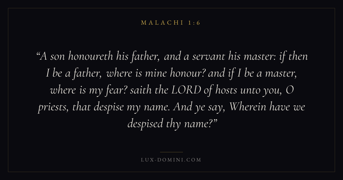 A son honoureth his father, and a servant his master: if then I be a father, where is mine honour? and if I be a master, where is my fear? saith the LORD of hosts unto you, O priests, that despise my name. And ye say, Wherein have we despised thy name?