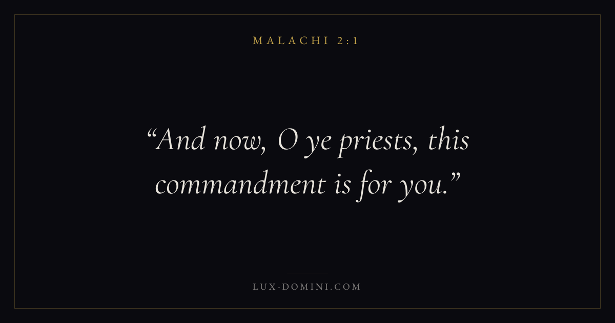 Books / Malachi / Chapter 2 / Verse 1 ← Malachi 1:14 Malachi 2:1 Malachi 2:2 → And now, O ye priests, this commandment is for you. Download verse card Share on Twitter Share on Facebook Pin it ✦ Key themes LovePeaceGraceTruthWorship Read with Malachi 2:2John 3:161 Corinthians 13:4John 14:27 Related topics Bible verses about loveBible verses about peaceBible verses about graceBible verses about truthBible verses about worship ✦ Malachi Chapter 2 verses V. 1 V. 2 V. 3 V. 4 V. 5 V. 6 V. 7 V. 8 V. 9 V. 10 V. 11 V. 12 V. 13 V. 14 V. 15 V. 16 V. 17