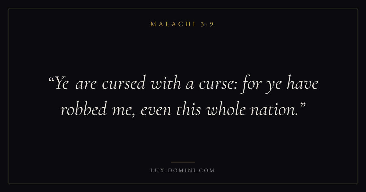 Books / Malachi / Chapter 3 / Verse 9 ← Malachi 3:8 Malachi 3:9 Malachi 3:10 → Ye are cursed with a curse: for ye have robbed me, even this whole nation. Download verse card Share on Twitter Share on Facebook Pin it ✦ Key themes LoveGraceWorshipCovenant love Read with Malachi 3:8Malachi 3:10John 3:161 Corinthians 13:4 Related topics Bible verses about loveBible verses about graceBible verses about worship ✦ Malachi Chapter 3 verses V. 1 V. 2 V. 3 V. 4 V. 5 V. 6 V. 7 V. 8 V. 9 V. 10 V. 11 V. 12 V. 13 V. 14 V. 15 V. 16 V. 17 V. 18