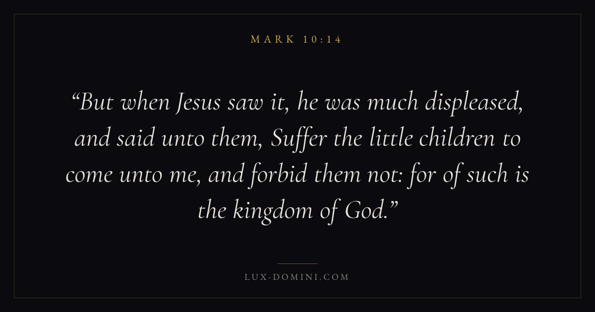 But when Jesus saw it, he was much displeased, and said unto them, Suffer the little children to come unto me, and forbid them not: for of such is the kingdom of God.