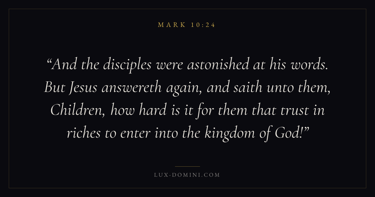 And the disciples were astonished at his words. But Jesus answereth again, and saith unto them, Children, how hard is it for them that trust in riches to enter into the kingdom of God!