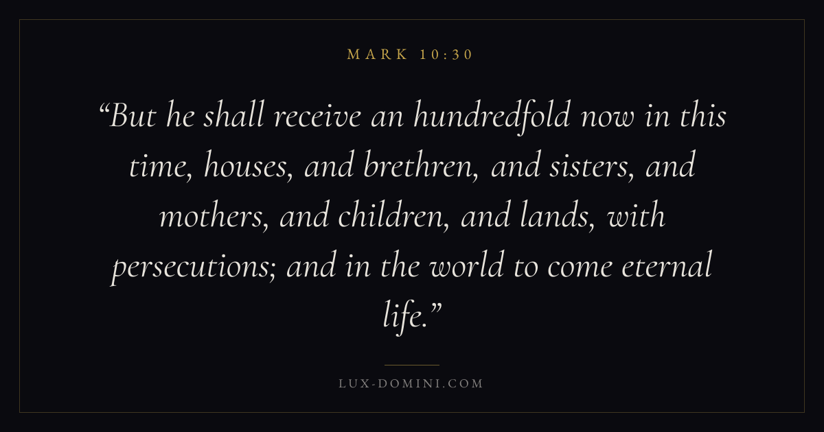 But he shall receive an hundredfold now in this time, houses, and brethren, and sisters, and mothers, and children, and lands, with persecutions; and in the world to come eternal life.