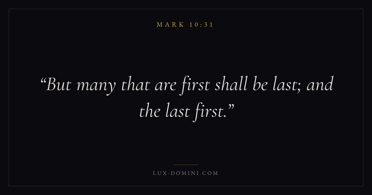Books / Mark / Chapter 10 / Verse 31 ← Mark 10:30 Mark 10:31 Mark 10:32 → But many that are first shall be last; and the last first. Download verse card Share on Twitter Share on Facebook Pin it ✦ Key themes FaithSuffering and trialsSalvationGraceDiscipleship Read with Mark 10:28Mark 10:29Hebrews 11:1Romans 10:17 Related topics Bible verses about faithBible verses about suffering and trialsBible verses about salvationBible verses about grace ✦ Mark Chapter 10 verses V. 1 V. 2 V. 3 V. 4 V. 5 V. 6 V. 7 V. 8 V. 9 V. 10 V. 11 V. 12 V. 13 V. 14 V. 15 V. 16 V. 17 V. 18 V. 19 V. 20 V. 21 V. 22 V. 23 V. 24 V. 25 V. 26 V. 27 V. 28 V. 29 V. 30 V. 31 V. 32 V. 33 V. 34 V. 35 V. 36 V. 37 V. 38 V. 39 V. 40 V. 41 V. 42 V. 43 V. 44 V. 45 V. 46 V. 47 V. 48 V. 49 V. 50 V. 51 V. 52