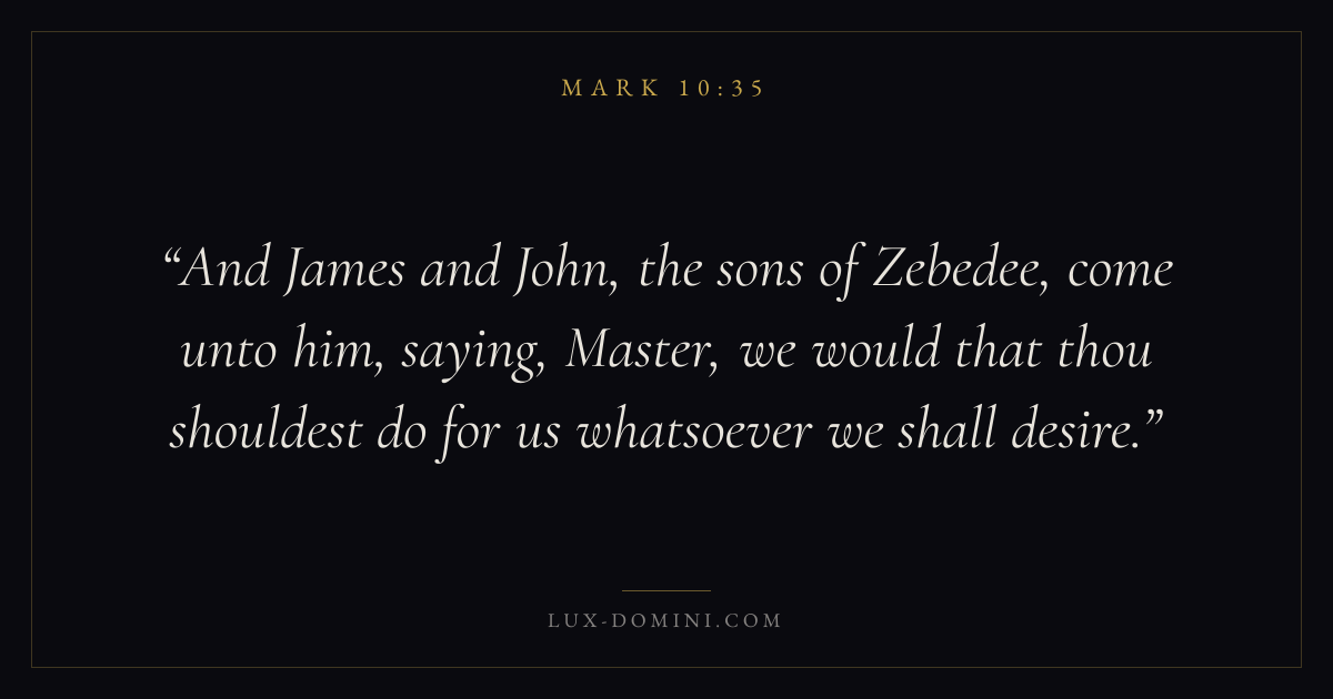 And James and John, the sons of Zebedee, come unto him, saying, Master, we would that thou shouldest do for us whatsoever we shall desire.