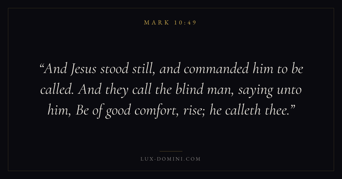 And Jesus stood still, and commanded him to be called. And they call the blind man, saying unto him, Be of good comfort, rise; he calleth thee.