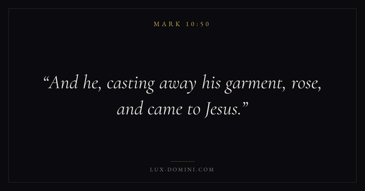 Books / Mark / Chapter 10 / Verse 50 ← Mark 10:49 Mark 10:50 Mark 10:51 → And he, casting away his garment, rose, and came to Jesus. Download verse card Share on Twitter Share on Facebook Pin it ✦ Key themes FaithHopeSuffering and trialsDiscipleship Read with Mark 10:46Mark 10:47Hebrews 11:1Romans 10:17 Related topics Bible verses about faithBible verses about hopeBible verses about suffering and trials ✦ Mark Chapter 10 verses V. 1 V. 2 V. 3 V. 4 V. 5 V. 6 V. 7 V. 8 V. 9 V. 10 V. 11 V. 12 V. 13 V. 14 V. 15 V. 16 V. 17 V. 18 V. 19 V. 20 V. 21 V. 22 V. 23 V. 24 V. 25 V. 26 V. 27 V. 28 V. 29 V. 30 V. 31 V. 32 V. 33 V. 34 V. 35 V. 36 V. 37 V. 38 V. 39 V. 40 V. 41 V. 42 V. 43 V. 44 V. 45 V. 46 V. 47 V. 48 V. 49 V. 50 V. 51 V. 52