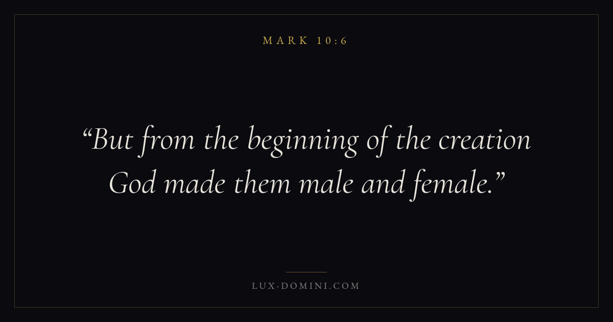 Books / Mark / Chapter 10 / Verse 6 ← Mark 10:5 Mark 10:6 Mark 10:7 → But from the beginning of the creation God made them male and female. Download verse card Share on Twitter Share on Facebook Pin it ✦ Key themes FaithSuffering and trialsDiscipleshipThe cross Read with Mark 10:2Mark 10:3Hebrews 11:1Romans 10:17 Related topics Bible verses about faithBible verses about suffering and trials ✦ Mark Chapter 10 verses V. 1 V. 2 V. 3 V. 4 V. 5 V. 6 V. 7 V. 8 V. 9 V. 10 V. 11 V. 12 V. 13 V. 14 V. 15 V. 16 V. 17 V. 18 V. 19 V. 20 V. 21 V. 22 V. 23 V. 24 V. 25 V. 26 V. 27 V. 28 V. 29 V. 30 V. 31 V. 32 V. 33 V. 34 V. 35 V. 36 V. 37 V. 38 V. 39 V. 40 V. 41 V. 42 V. 43 V. 44 V. 45 V. 46 V. 47 V. 48 V. 49 V. 50 V. 51 V. 52