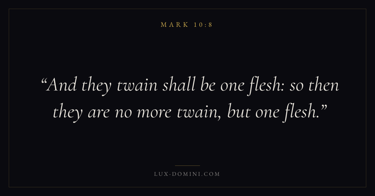 Books / Mark / Chapter 10 / Verse 8 ← Mark 10:7 Mark 10:8 Mark 10:9 → And they twain shall be one flesh: so then they are no more twain, but one flesh. Download verse card Share on Twitter Share on Facebook Pin it ✦ Key themes FaithSuffering and trialsDiscipleshipThe cross Read with Mark 10:7Hebrews 11:1Romans 10:17Romans 8:18 Related topics Bible verses about faithBible verses about suffering and trials ✦ Mark Chapter 10 verses V. 1 V. 2 V. 3 V. 4 V. 5 V. 6 V. 7 V. 8 V. 9 V. 10 V. 11 V. 12 V. 13 V. 14 V. 15 V. 16 V. 17 V. 18 V. 19 V. 20 V. 21 V. 22 V. 23 V. 24 V. 25 V. 26 V. 27 V. 28 V. 29 V. 30 V. 31 V. 32 V. 33 V. 34 V. 35 V. 36 V. 37 V. 38 V. 39 V. 40 V. 41 V. 42 V. 43 V. 44 V. 45 V. 46 V. 47 V. 48 V. 49 V. 50 V. 51 V. 52