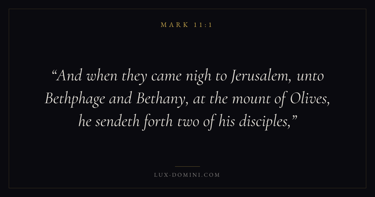 And when they came nigh to Jerusalem, unto Bethphage and Bethany, at the mount of Olives, he sendeth forth two of his disciples,