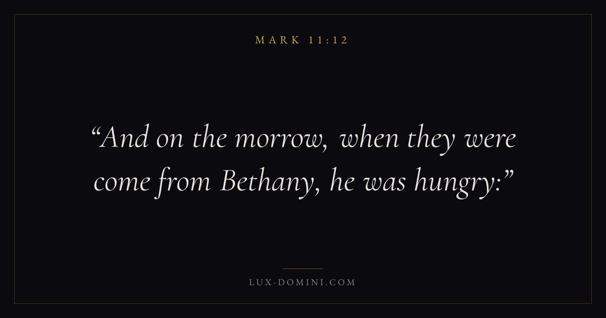 Books / Mark / Chapter 11 / Verse 12 ← Mark 11:11 Mark 11:12 Mark 11:13 → And on the morrow, when they were come from Bethany, he was hungry: Download verse card Share on Twitter Share on Facebook Pin it ✦ Key themes FaithSuffering and trialsDiscipleshipThe cross Read with Mark 11:13Mark 11:14Hebrews 11:1Romans 10:17 Related topics Bible verses about faithBible verses about suffering and trials Glossary Bethany Place House of dates. (1. ) The Revised Version in John 1:28 has this word instead of Bethabara, on the authority of the oldest manuscripts. It appears to have been the name of a place on the east of Jordan. Modern identification: Al Eizariya. ✦ Mark Chapter 11 verses V. 1 V. 2 V. 3 V. 4 V. 5 V. 6 V. 7 V. 8 V. 9 V. 10 V. 11 V. 12 V. 13 V. 14 V. 15 V. 16 V. 17 V. 18 V. 19 V. 20 V. 21 V. 22 V. 23 V. 24 V. 25 V. 26 V. 27 V. 28 V. 29 V. 30 V. 31 V. 32 V. 33