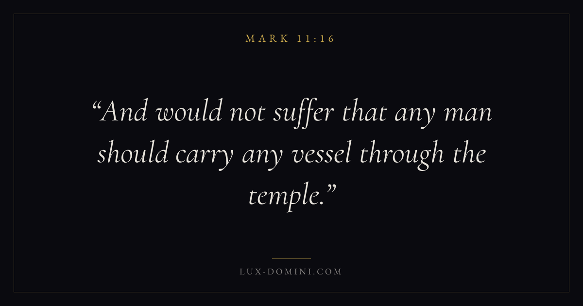 Books / Mark / Chapter 11 / Verse 16 ← Mark 11:15 Mark 11:16 Mark 11:17 → And would not suffer that any man should carry any vessel through the temple. Download verse card Share on Twitter Share on Facebook Pin it ✦ Key themes FaithSuffering and trialsDiscipleshipThe cross Read with Mark 11:15Mark 11:17Hebrews 11:1Romans 10:17 Related topics Bible verses about faithBible verses about suffering and trials ✦ Mark Chapter 11 verses V. 1 V. 2 V. 3 V. 4 V. 5 V. 6 V. 7 V. 8 V. 9 V. 10 V. 11 V. 12 V. 13 V. 14 V. 15 V. 16 V. 17 V. 18 V. 19 V. 20 V. 21 V. 22 V. 23 V. 24 V. 25 V. 26 V. 27 V. 28 V. 29 V. 30 V. 31 V. 32 V. 33