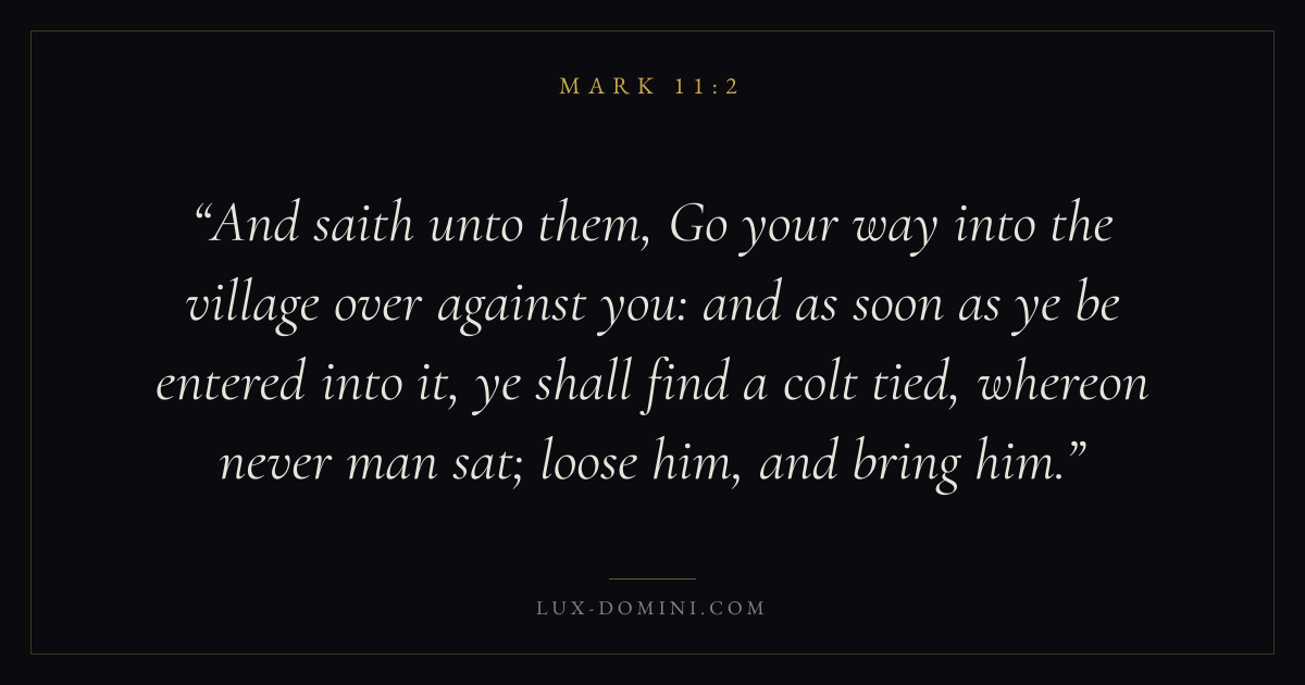 And saith unto them, Go your way into the village over against you: and as soon as ye be entered into it, ye shall find a colt tied, whereon never man sat; loose him, and bring him.