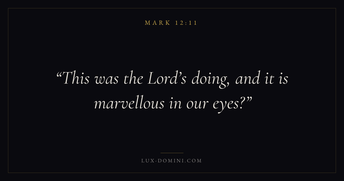 Books / Mark / Chapter 12 / Verse 11 ← Mark 12:10 Mark 12:11 Mark 12:12 → This was the Lord’s doing, and it is marvellous in our eyes? Download verse card Share on Twitter Share on Facebook Pin it ✦ Key themes FaithSuffering and trialsDiscipleshipThe cross Read with Mark 12:9Mark 12:10Hebrews 11:1Romans 10:17 Related topics Bible verses about faithBible verses about suffering and trials ✦ Mark Chapter 12 verses V. 1 V. 2 V. 3 V. 4 V. 5 V. 6 V. 7 V. 8 V. 9 V. 10 V. 11 V. 12 V. 13 V. 14 V. 15 V. 16 V. 17 V. 18 V. 19 V. 20 V. 21 V. 22 V. 23 V. 24 V. 25 V. 26 V. 27 V. 28 V. 29 V. 30 V. 31 V. 32 V. 33 V. 34 V. 35 V. 36 V. 37 V. 38 V. 39 V. 40 V. 41 V. 42 V. 43 V. 44