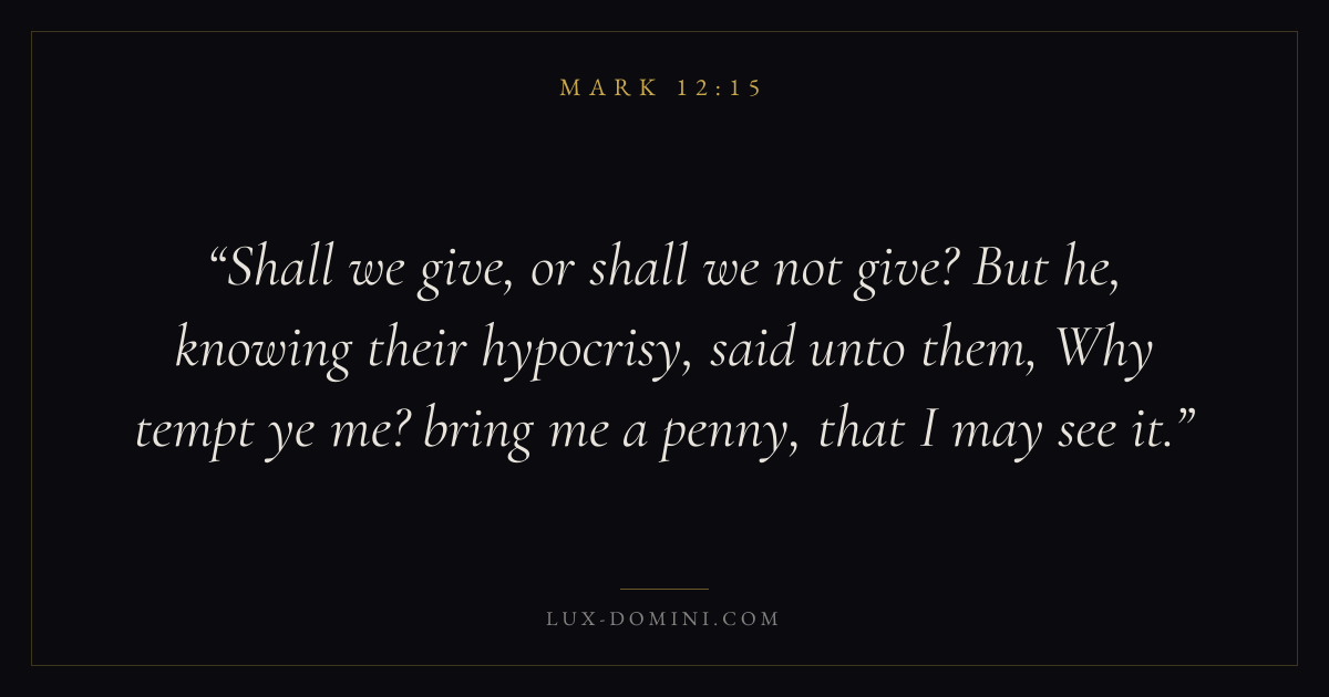 Shall we give, or shall we not give? But he, knowing their hypocrisy, said unto them, Why tempt ye me? bring me a penny, that I may see it.