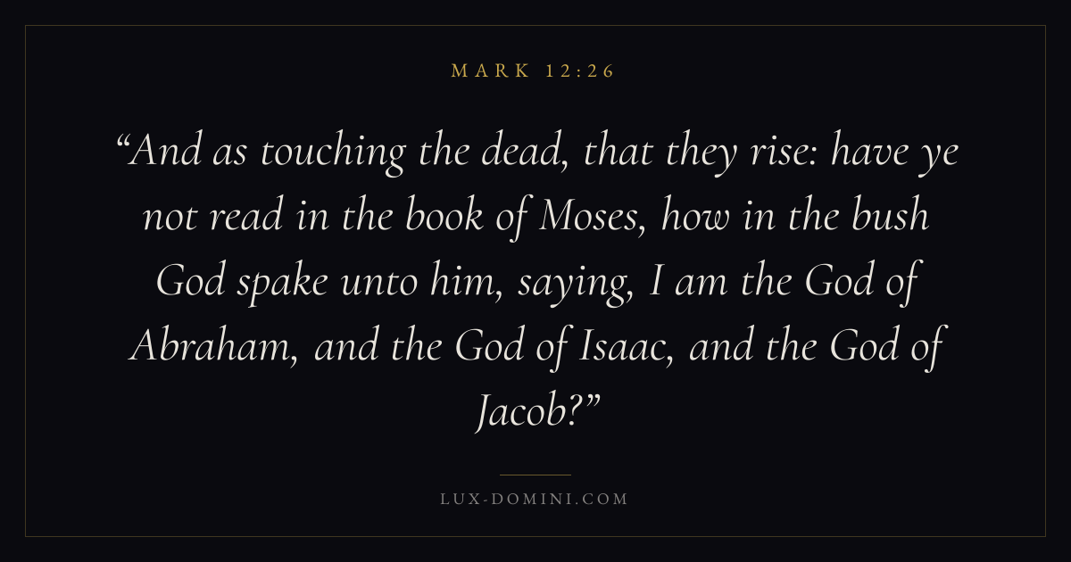 And as touching the dead, that they rise: have ye not read in the book of Moses, how in the bush God spake unto him, saying, I am the God of Abraham, and the God of Isaac, and the God of Jacob?