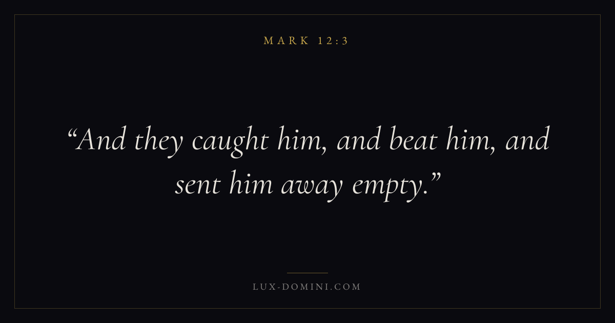 Books / Mark / Chapter 12 / Verse 3 ← Mark 12:2 Mark 12:3 Mark 12:4 → And they caught him, and beat him, and sent him away empty. Download verse card Share on Twitter Share on Facebook Pin it ✦ Key themes FaithSuffering and trialsDiscipleshipThe cross Read with Mark 12:1Mark 12:2Hebrews 11:1Romans 10:17 Related topics Bible verses about faithBible verses about suffering and trials ✦ Mark Chapter 12 verses V. 1 V. 2 V. 3 V. 4 V. 5 V. 6 V. 7 V. 8 V. 9 V. 10 V. 11 V. 12 V. 13 V. 14 V. 15 V. 16 V. 17 V. 18 V. 19 V. 20 V. 21 V. 22 V. 23 V. 24 V. 25 V. 26 V. 27 V. 28 V. 29 V. 30 V. 31 V. 32 V. 33 V. 34 V. 35 V. 36 V. 37 V. 38 V. 39 V. 40 V. 41 V. 42 V. 43 V. 44