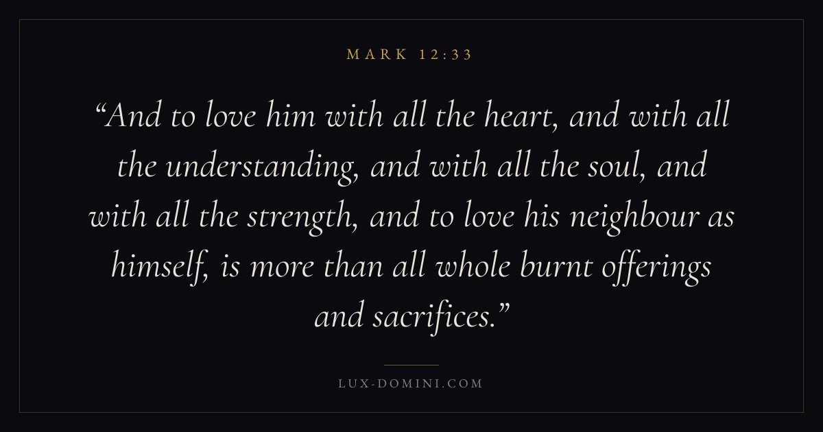 And to love him with all the heart, and with all the understanding, and with all the soul, and with all the strength, and to love his neighbour as himself, is more than all whole burnt offerings and sacrifices.