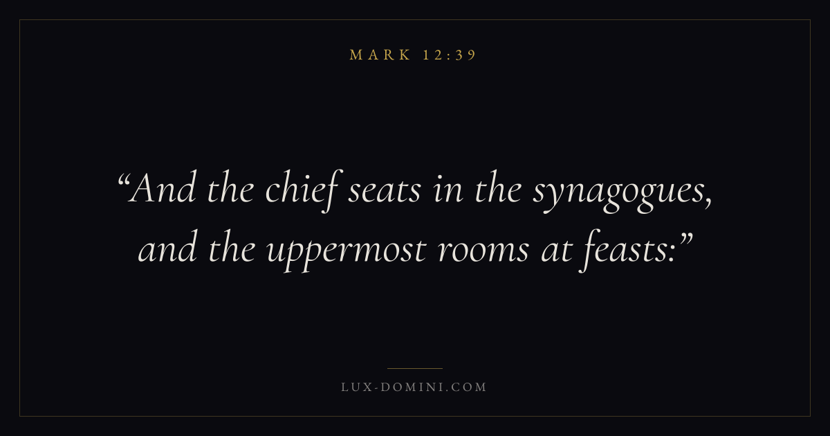 Books / Mark / Chapter 12 / Verse 39 ← Mark 12:38 Mark 12:39 Mark 12:40 → And the chief seats in the synagogues, and the uppermost rooms at feasts: Download verse card Share on Twitter Share on Facebook Pin it ✦ Key themes FaithSuffering and trialsDiscipleshipThe cross Read with Mark 12:38Mark 12:40Hebrews 11:1Romans 10:17 Related topics Bible verses about faithBible verses about suffering and trials ✦ Mark Chapter 12 verses V. 1 V. 2 V. 3 V. 4 V. 5 V. 6 V. 7 V. 8 V. 9 V. 10 V. 11 V. 12 V. 13 V. 14 V. 15 V. 16 V. 17 V. 18 V. 19 V. 20 V. 21 V. 22 V. 23 V. 24 V. 25 V. 26 V. 27 V. 28 V. 29 V. 30 V. 31 V. 32 V. 33 V. 34 V. 35 V. 36 V. 37 V. 38 V. 39 V. 40 V. 41 V. 42 V. 43 V. 44
