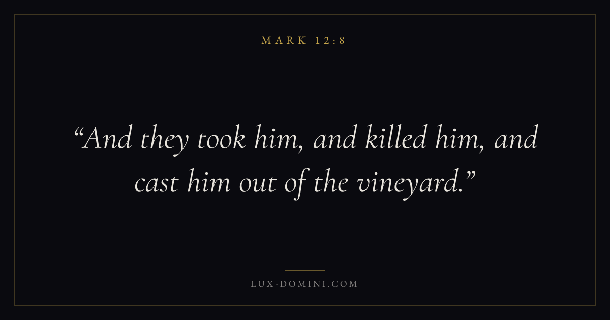 Books / Mark / Chapter 12 / Verse 8 ← Mark 12:7 Mark 12:8 Mark 12:9 → And they took him, and killed him, and cast him out of the vineyard. Download verse card Share on Twitter Share on Facebook Pin it ✦ Key themes FaithSuffering and trialsDiscipleshipThe cross Read with Mark 12:6Mark 12:7Hebrews 11:1Romans 10:17 Related topics Bible verses about faithBible verses about suffering and trials ✦ Mark Chapter 12 verses V. 1 V. 2 V. 3 V. 4 V. 5 V. 6 V. 7 V. 8 V. 9 V. 10 V. 11 V. 12 V. 13 V. 14 V. 15 V. 16 V. 17 V. 18 V. 19 V. 20 V. 21 V. 22 V. 23 V. 24 V. 25 V. 26 V. 27 V. 28 V. 29 V. 30 V. 31 V. 32 V. 33 V. 34 V. 35 V. 36 V. 37 V. 38 V. 39 V. 40 V. 41 V. 42 V. 43 V. 44