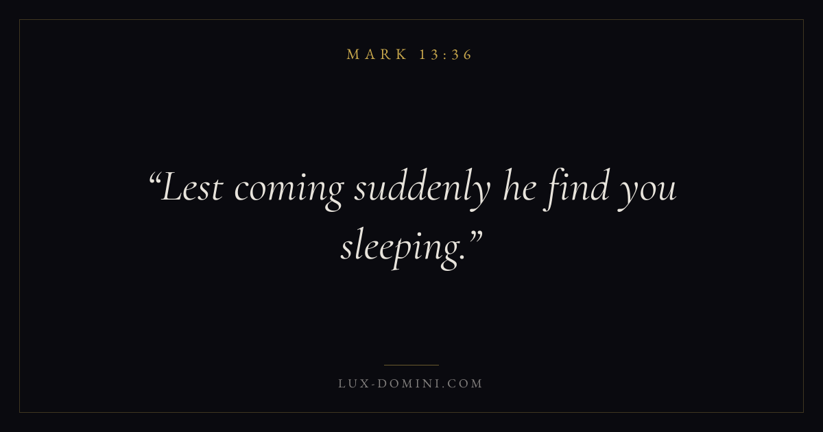 Books / Mark / Chapter 13 / Verse 36 ← Mark 13:35 Mark 13:36 Mark 13:37 → Lest coming suddenly he find you sleeping. Download verse card Share on Twitter Share on Facebook Pin it ✦ Key themes FaithSuffering and trialsDiscipleshipThe cross Read with Mark 13:35Mark 13:37Hebrews 11:1Romans 10:17 Related topics Bible verses about faithBible verses about suffering and trials ✦ Mark Chapter 13 verses V. 1 V. 2 V. 3 V. 4 V. 5 V. 6 V. 7 V. 8 V. 9 V. 10 V. 11 V. 12 V. 13 V. 14 V. 15 V. 16 V. 17 V. 18 V. 19 V. 20 V. 21 V. 22 V. 23 V. 24 V. 25 V. 26 V. 27 V. 28 V. 29 V. 30 V. 31 V. 32 V. 33 V. 34 V. 35 V. 36 V. 37