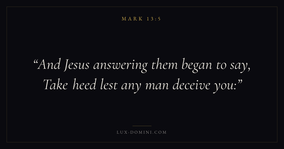 Books / Mark / Chapter 13 / Verse 5 ← Mark 13:4 Mark 13:5 Mark 13:6 → And Jesus answering them began to say, Take heed lest any man deceive you: Download verse card Share on Twitter Share on Facebook Pin it ✦ Key themes FaithSuffering and trialsDiscipleshipThe cross Read with Mark 13:1Mark 13:2Hebrews 11:1Romans 10:17 Related topics Bible verses about faithBible verses about suffering and trials ✦ Mark Chapter 13 verses V. 1 V. 2 V. 3 V. 4 V. 5 V. 6 V. 7 V. 8 V. 9 V. 10 V. 11 V. 12 V. 13 V. 14 V. 15 V. 16 V. 17 V. 18 V. 19 V. 20 V. 21 V. 22 V. 23 V. 24 V. 25 V. 26 V. 27 V. 28 V. 29 V. 30 V. 31 V. 32 V. 33 V. 34 V. 35 V. 36 V. 37