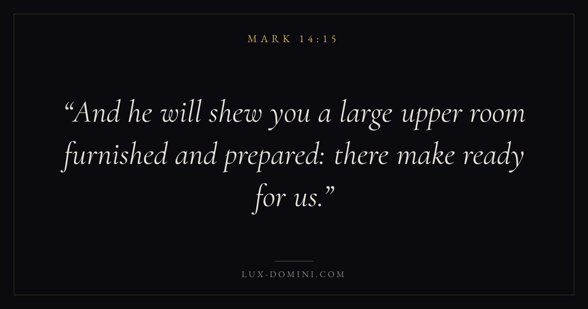 Books / Mark / Chapter 14 / Verse 15 ← Mark 14:14 Mark 14:15 Mark 14:16 → And he will shew you a large upper room furnished and prepared: there make ready for us. Download verse card Share on Twitter Share on Facebook Pin it ✦ Key themes FaithSuffering and trialsDiscipleshipThe cross Read with Mark 14:12Mark 14:13Hebrews 11:1Romans 10:17 Related topics Bible verses about faithBible verses about suffering and trials ✦ Mark Chapter 14 verses V. 1 V. 2 V. 3 V. 4 V. 5 V. 6 V. 7 V. 8 V. 9 V. 10 V. 11 V. 12 V. 13 V. 14 V. 15 V. 16 V. 17 V. 18 V. 19 V. 20 V. 21 V. 22 V. 23 V. 24 V. 25 V. 26 V. 27 V. 28 V. 29 V. 30 V. 31 V. 32 V. 33 V. 34 V. 35 V. 36 V. 37 V. 38 V. 39 V. 40 V. 41 V. 42 V. 43 V. 44 V. 45 V. 46 V. 47 V. 48 V. 49 V. 50 V. 51 V. 52 V. 53 V. 54 V. 55 V. 56 V. 57 V. 58 V. 59 V. 60 V. 61 V. 62 V. 63 V. 64 V. 65 V. 66 V. 67 V. 68 V. 69 V. 70 V. 71 V. 72