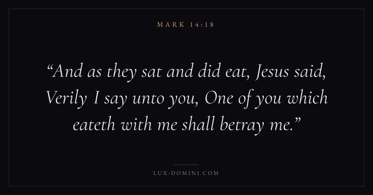 And as they sat and did eat, Jesus said, Verily I say unto you, One of you which eateth with me shall betray me.