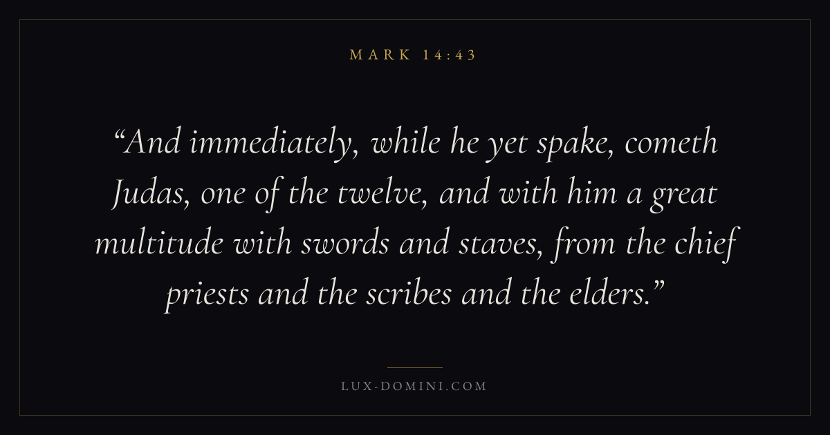 And immediately, while he yet spake, cometh Judas, one of the twelve, and with him a great multitude with swords and staves, from the chief priests and the scribes and the elders.