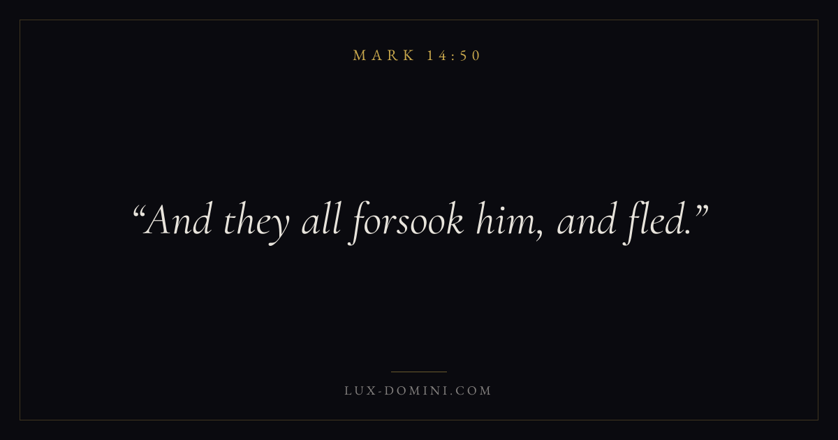 Books / Mark / Chapter 14 / Verse 50 ← Mark 14:49 Mark 14:50 Mark 14:51 → And they all forsook him, and fled. Download verse card Share on Twitter Share on Facebook Pin it ✦ Key themes FaithSuffering and trialsDiscipleshipThe cross Read with Mark 14:49Mark 14:51Hebrews 11:1Romans 10:17 Related topics Bible verses about faithBible verses about suffering and trials ✦ Mark Chapter 14 verses V. 1 V. 2 V. 3 V. 4 V. 5 V. 6 V. 7 V. 8 V. 9 V. 10 V. 11 V. 12 V. 13 V. 14 V. 15 V. 16 V. 17 V. 18 V. 19 V. 20 V. 21 V. 22 V. 23 V. 24 V. 25 V. 26 V. 27 V. 28 V. 29 V. 30 V. 31 V. 32 V. 33 V. 34 V. 35 V. 36 V. 37 V. 38 V. 39 V. 40 V. 41 V. 42 V. 43 V. 44 V. 45 V. 46 V. 47 V. 48 V. 49 V. 50 V. 51 V. 52 V. 53 V. 54 V. 55 V. 56 V. 57 V. 58 V. 59 V. 60 V. 61 V. 62 V. 63 V. 64 V. 65 V. 66 V. 67 V. 68 V. 69 V. 70 V. 71 V. 72