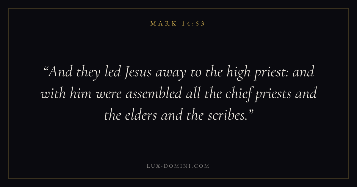 And they led Jesus away to the high priest: and with him were assembled all the chief priests and the elders and the scribes.