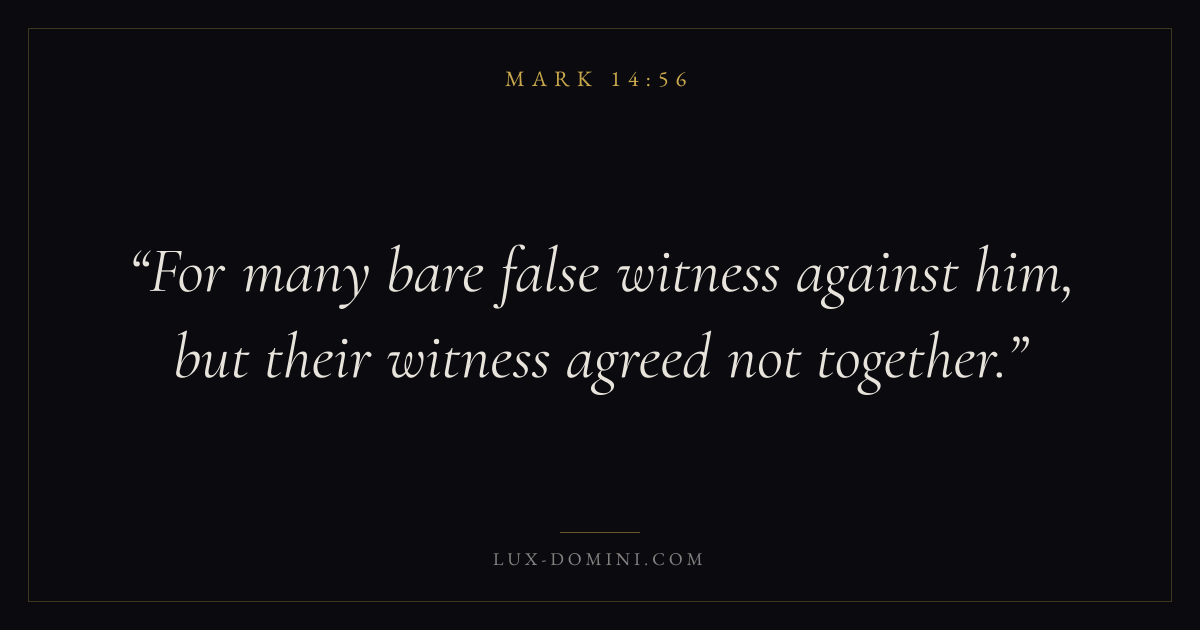 Books / Mark / Chapter 14 / Verse 56 ← Mark 14:55 Mark 14:56 Mark 14:57 → For many bare false witness against him, but their witness agreed not together. Download verse card Share on Twitter Share on Facebook Pin it ✦ Key themes FaithSuffering and trialsTruthDiscipleship Read with Mark 14:53Mark 14:54Hebrews 11:1Romans 10:17 Related topics Bible verses about faithBible verses about suffering and trialsBible verses about truth ✦ Mark Chapter 14 verses V. 1 V. 2 V. 3 V. 4 V. 5 V. 6 V. 7 V. 8 V. 9 V. 10 V. 11 V. 12 V. 13 V. 14 V. 15 V. 16 V. 17 V. 18 V. 19 V. 20 V. 21 V. 22 V. 23 V. 24 V. 25 V. 26 V. 27 V. 28 V. 29 V. 30 V. 31 V. 32 V. 33 V. 34 V. 35 V. 36 V. 37 V. 38 V. 39 V. 40 V. 41 V. 42 V. 43 V. 44 V. 45 V. 46 V. 47 V. 48 V. 49 V. 50 V. 51 V. 52 V. 53 V. 54 V. 55 V. 56 V. 57 V. 58 V. 59 V. 60 V. 61 V. 62 V. 63 V. 64 V. 65 V. 66 V. 67 V. 68 V. 69 V. 70 V. 71 V. 72