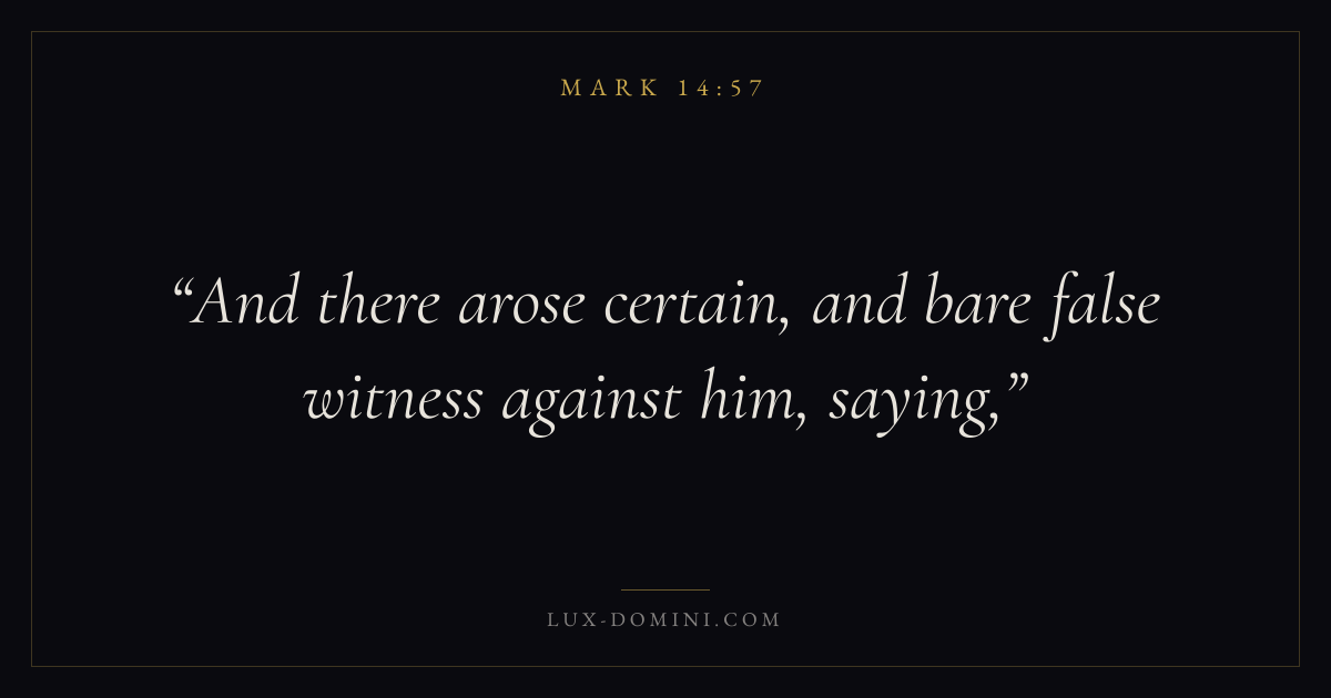 Books / Mark / Chapter 14 / Verse 57 ← Mark 14:56 Mark 14:57 Mark 14:58 → And there arose certain, and bare false witness against him, saying, Download verse card Share on Twitter Share on Facebook Pin it ✦ Key themes FaithSuffering and trialsTruthDiscipleship Read with Mark 14:53Mark 14:54Hebrews 11:1Romans 10:17 Related topics Bible verses about faithBible verses about suffering and trialsBible verses about truth ✦ Mark Chapter 14 verses V. 1 V. 2 V. 3 V. 4 V. 5 V. 6 V. 7 V. 8 V. 9 V. 10 V. 11 V. 12 V. 13 V. 14 V. 15 V. 16 V. 17 V. 18 V. 19 V. 20 V. 21 V. 22 V. 23 V. 24 V. 25 V. 26 V. 27 V. 28 V. 29 V. 30 V. 31 V. 32 V. 33 V. 34 V. 35 V. 36 V. 37 V. 38 V. 39 V. 40 V. 41 V. 42 V. 43 V. 44 V. 45 V. 46 V. 47 V. 48 V. 49 V. 50 V. 51 V. 52 V. 53 V. 54 V. 55 V. 56 V. 57 V. 58 V. 59 V. 60 V. 61 V. 62 V. 63 V. 64 V. 65 V. 66 V. 67 V. 68 V. 69 V. 70 V. 71 V. 72