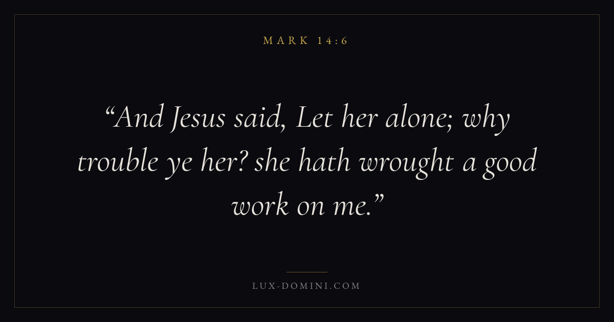 Books / Mark / Chapter 14 / Verse 6 ← Mark 14:5 Mark 14:6 Mark 14:7 → And Jesus said, Let her alone; why trouble ye her? she hath wrought a good work on me. Download verse card Share on Twitter Share on Facebook Pin it ✦ Key themes FaithSuffering and trialsDiscipleshipThe cross Read with Mark 14:3Mark 14:4Hebrews 11:1Romans 10:17 Related topics Bible verses about faithBible verses about suffering and trials ✦ Mark Chapter 14 verses V. 1 V. 2 V. 3 V. 4 V. 5 V. 6 V. 7 V. 8 V. 9 V. 10 V. 11 V. 12 V. 13 V. 14 V. 15 V. 16 V. 17 V. 18 V. 19 V. 20 V. 21 V. 22 V. 23 V. 24 V. 25 V. 26 V. 27 V. 28 V. 29 V. 30 V. 31 V. 32 V. 33 V. 34 V. 35 V. 36 V. 37 V. 38 V. 39 V. 40 V. 41 V. 42 V. 43 V. 44 V. 45 V. 46 V. 47 V. 48 V. 49 V. 50 V. 51 V. 52 V. 53 V. 54 V. 55 V. 56 V. 57 V. 58 V. 59 V. 60 V. 61 V. 62 V. 63 V. 64 V. 65 V. 66 V. 67 V. 68 V. 69 V. 70 V. 71 V. 72