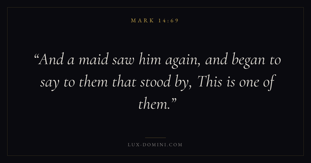 Books / Mark / Chapter 14 / Verse 69 ← Mark 14:68 Mark 14:69 Mark 14:70 → And a maid saw him again, and began to say to them that stood by, This is one of them. Download verse card Share on Twitter Share on Facebook Pin it ✦ Key themes FaithSuffering and trialsDiscipleshipThe cross Read with Mark 14:66Mark 14:67Hebrews 11:1Romans 10:17 Related topics Bible verses about faithBible verses about suffering and trials ✦ Mark Chapter 14 verses V. 1 V. 2 V. 3 V. 4 V. 5 V. 6 V. 7 V. 8 V. 9 V. 10 V. 11 V. 12 V. 13 V. 14 V. 15 V. 16 V. 17 V. 18 V. 19 V. 20 V. 21 V. 22 V. 23 V. 24 V. 25 V. 26 V. 27 V. 28 V. 29 V. 30 V. 31 V. 32 V. 33 V. 34 V. 35 V. 36 V. 37 V. 38 V. 39 V. 40 V. 41 V. 42 V. 43 V. 44 V. 45 V. 46 V. 47 V. 48 V. 49 V. 50 V. 51 V. 52 V. 53 V. 54 V. 55 V. 56 V. 57 V. 58 V. 59 V. 60 V. 61 V. 62 V. 63 V. 64 V. 65 V. 66 V. 67 V. 68 V. 69 V. 70 V. 71 V. 72