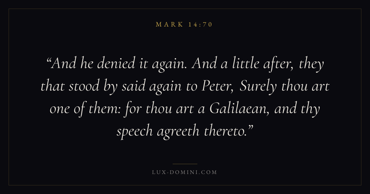 And he denied it again. And a little after, they that stood by said again to Peter, Surely thou art one of them: for thou art a Galilaean, and thy speech agreeth thereto.