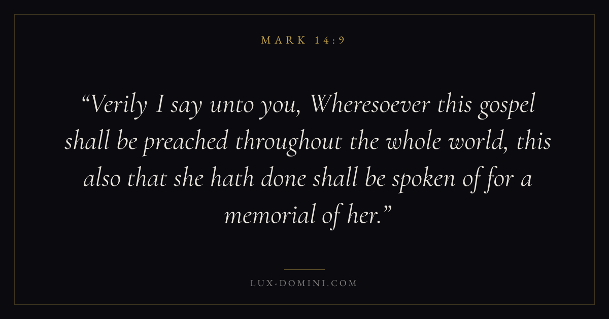 Verily I say unto you, Wheresoever this gospel shall be preached throughout the whole world, this also that she hath done shall be spoken of for a memorial of her.