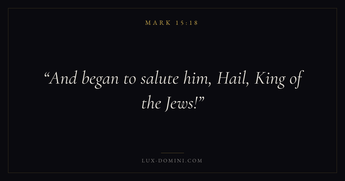 Books / Mark / Chapter 15 / Verse 18 ← Mark 15:17 Mark 15:18 Mark 15:19 → And began to salute him, Hail, King of the Jews! Download verse card Share on Twitter Share on Facebook Pin it ✦ Key themes FaithAnxiety and fearSuffering and trialsDiscipleship Read with Mark 15:15Mark 15:16Hebrews 11:1Romans 10:17 Related topics Bible verses about faithBible verses about anxiety and fearBible verses about suffering and trials ✦ Mark Chapter 15 verses V. 1 V. 2 V. 3 V. 4 V. 5 V. 6 V. 7 V. 8 V. 9 V. 10 V. 11 V. 12 V. 13 V. 14 V. 15 V. 16 V. 17 V. 18 V. 19 V. 20 V. 21 V. 22 V. 23 V. 24 V. 25 V. 26 V. 27 V. 28 V. 29 V. 30 V. 31 V. 32 V. 33 V. 34 V. 35 V. 36 V. 37 V. 38 V. 39 V. 40 V. 41 V. 42 V. 43 V. 44 V. 45 V. 46 V. 47