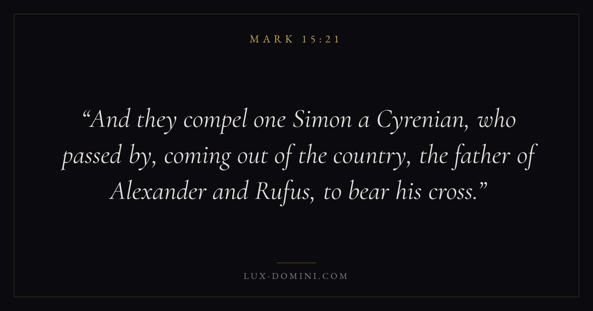 And they compel one Simon a Cyrenian, who passed by, coming out of the country, the father of Alexander and Rufus, to bear his cross.