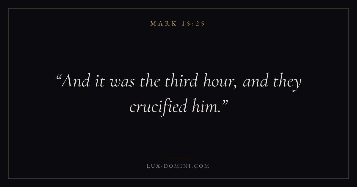 Books / Mark / Chapter 15 / Verse 25 ← Mark 15:24 Mark 15:25 Mark 15:26 → And it was the third hour, and they crucified him. Download verse card Share on Twitter Share on Facebook Pin it ✦ Key themes FaithSuffering and trialsDiscipleshipThe cross Read with Mark 15:26Mark 15:27Hebrews 11:1Romans 10:17 Related topics Bible verses about faithBible verses about suffering and trials ✦ Mark Chapter 15 verses V. 1 V. 2 V. 3 V. 4 V. 5 V. 6 V. 7 V. 8 V. 9 V. 10 V. 11 V. 12 V. 13 V. 14 V. 15 V. 16 V. 17 V. 18 V. 19 V. 20 V. 21 V. 22 V. 23 V. 24 V. 25 V. 26 V. 27 V. 28 V. 29 V. 30 V. 31 V. 32 V. 33 V. 34 V. 35 V. 36 V. 37 V. 38 V. 39 V. 40 V. 41 V. 42 V. 43 V. 44 V. 45 V. 46 V. 47