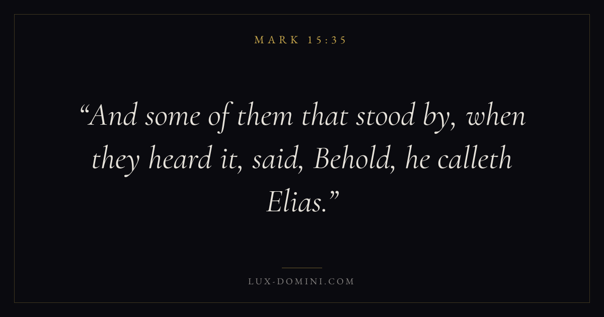 Books / Mark / Chapter 15 / Verse 35 ← Mark 15:34 Mark 15:35 Mark 15:36 → And some of them that stood by, when they heard it, said, Behold, he calleth Elias. Download verse card Share on Twitter Share on Facebook Pin it ✦ Key themes FaithSuffering and trialsDiscipleshipThe cross Read with Mark 15:32Mark 15:33Hebrews 11:1Romans 10:17 Related topics Bible verses about faithBible verses about suffering and trials ✦ Mark Chapter 15 verses V. 1 V. 2 V. 3 V. 4 V. 5 V. 6 V. 7 V. 8 V. 9 V. 10 V. 11 V. 12 V. 13 V. 14 V. 15 V. 16 V. 17 V. 18 V. 19 V. 20 V. 21 V. 22 V. 23 V. 24 V. 25 V. 26 V. 27 V. 28 V. 29 V. 30 V. 31 V. 32 V. 33 V. 34 V. 35 V. 36 V. 37 V. 38 V. 39 V. 40 V. 41 V. 42 V. 43 V. 44 V. 45 V. 46 V. 47