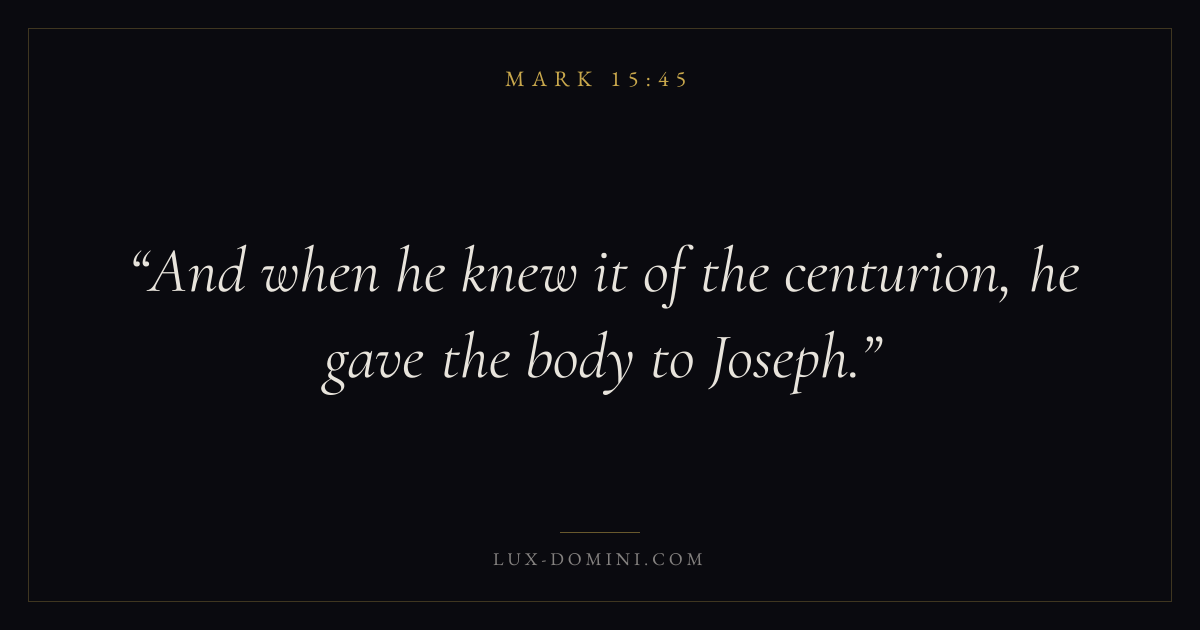Books / Mark / Chapter 15 / Verse 45 ← Mark 15:44 Mark 15:45 Mark 15:46 → And when he knew it of the centurion, he gave the body to Joseph. Download verse card Share on Twitter Share on Facebook Pin it ✦ Key themes FaithSuffering and trialsGraceDiscipleship Read with Mark 15:42Mark 15:43Hebrews 11:1Romans 10:17 Related topics Bible verses about faithBible verses about suffering and trialsBible verses about grace ✦ Mark Chapter 15 verses V. 1 V. 2 V. 3 V. 4 V. 5 V. 6 V. 7 V. 8 V. 9 V. 10 V. 11 V. 12 V. 13 V. 14 V. 15 V. 16 V. 17 V. 18 V. 19 V. 20 V. 21 V. 22 V. 23 V. 24 V. 25 V. 26 V. 27 V. 28 V. 29 V. 30 V. 31 V. 32 V. 33 V. 34 V. 35 V. 36 V. 37 V. 38 V. 39 V. 40 V. 41 V. 42 V. 43 V. 44 V. 45 V. 46 V. 47