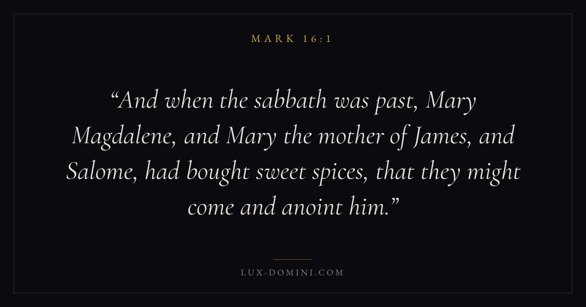 And when the sabbath was past, Mary Magdalene, and Mary the mother of James, and Salome, had bought sweet spices, that they might come and anoint him.