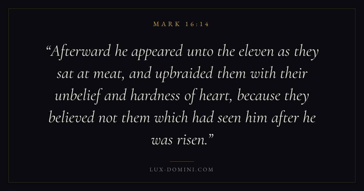 Afterward he appeared unto the eleven as they sat at meat, and upbraided them with their unbelief and hardness of heart, because they believed not them which had seen him after he was risen.
