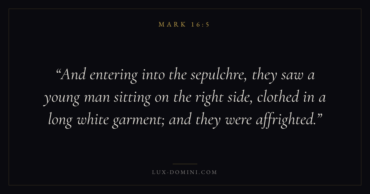 And entering into the sepulchre, they saw a young man sitting on the right side, clothed in a long white garment; and they were affrighted.