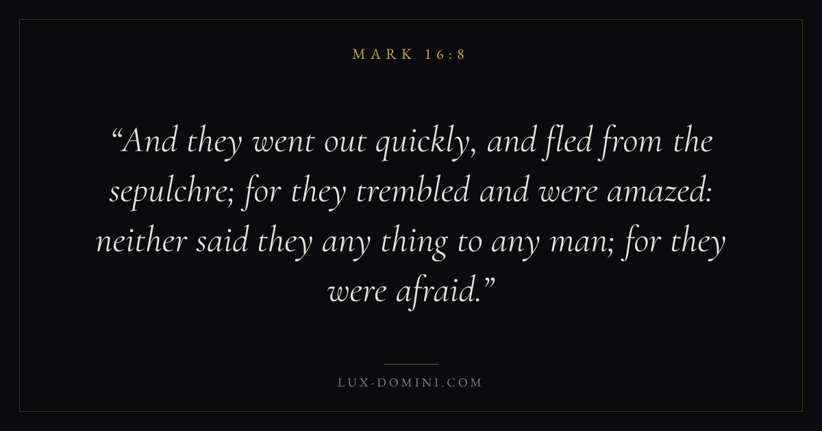 And they went out quickly, and fled from the sepulchre; for they trembled and were amazed: neither said they any thing to any man; for they were afraid.