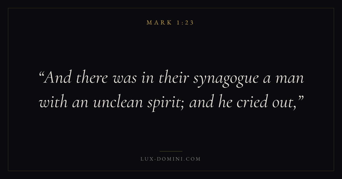 Books / Mark / Chapter 1 / Verse 23 ← Mark 1:22 Mark 1:23 Mark 1:24 → And there was in their synagogue a man with an unclean spirit; and he cried out, Download verse card Share on Twitter Share on Facebook Pin it ✦ Key themes FaithSuffering and trialsDiscipleshipThe cross Read with Mark 1:24Mark 1:25Hebrews 11:1Romans 10:17 Related topics Bible verses about faithBible verses about suffering and trials ✦ Mark Chapter 1 verses V. 1 V. 2 V. 3 V. 4 V. 5 V. 6 V. 7 V. 8 V. 9 V. 10 V. 11 V. 12 V. 13 V. 14 V. 15 V. 16 V. 17 V. 18 V. 19 V. 20 V. 21 V. 22 V. 23 V. 24 V. 25 V. 26 V. 27 V. 28 V. 29 V. 30 V. 31 V. 32 V. 33 V. 34 V. 35 V. 36 V. 37 V. 38 V. 39 V. 40 V. 41 V. 42 V. 43 V. 44 V. 45