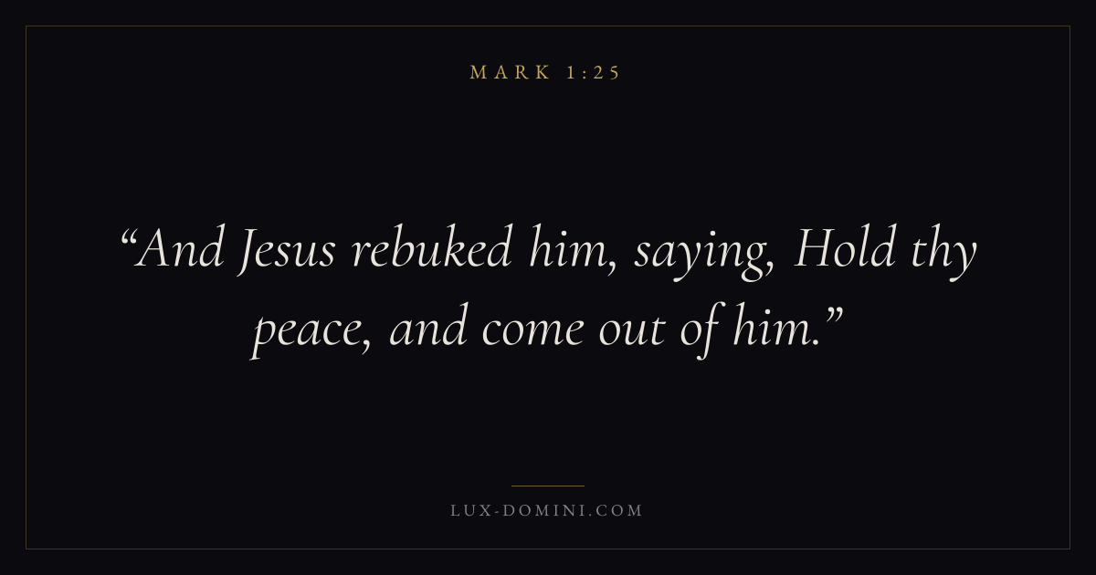Books / Mark / Chapter 1 / Verse 25 ← Mark 1:24 Mark 1:25 Mark 1:26 → And Jesus rebuked him, saying, Hold thy peace, and come out of him. Download verse card Share on Twitter Share on Facebook Pin it ✦ Key themes FaithSuffering and trialsPeaceDiscipleship Read with Mark 1:23Mark 1:24Hebrews 11:1Romans 10:17 Related topics Bible verses about faithBible verses about suffering and trialsBible verses about peace ✦ Mark Chapter 1 verses V. 1 V. 2 V. 3 V. 4 V. 5 V. 6 V. 7 V. 8 V. 9 V. 10 V. 11 V. 12 V. 13 V. 14 V. 15 V. 16 V. 17 V. 18 V. 19 V. 20 V. 21 V. 22 V. 23 V. 24 V. 25 V. 26 V. 27 V. 28 V. 29 V. 30 V. 31 V. 32 V. 33 V. 34 V. 35 V. 36 V. 37 V. 38 V. 39 V. 40 V. 41 V. 42 V. 43 V. 44 V. 45